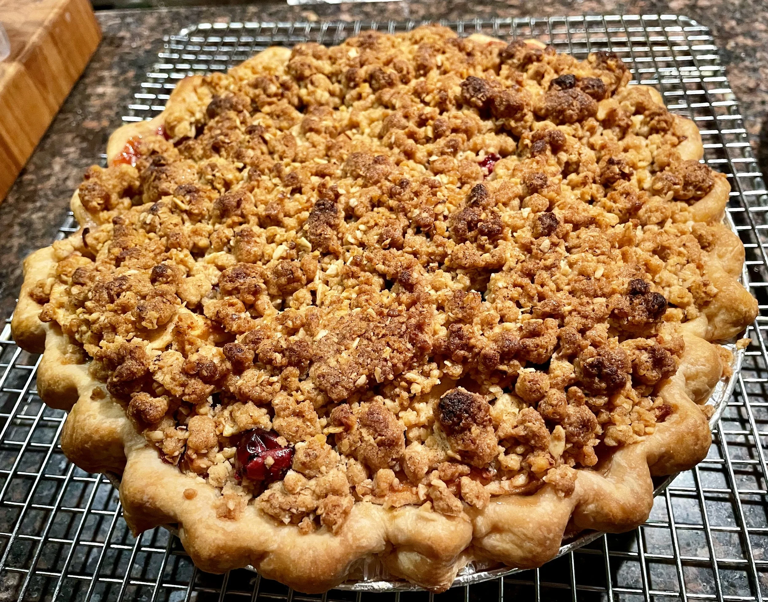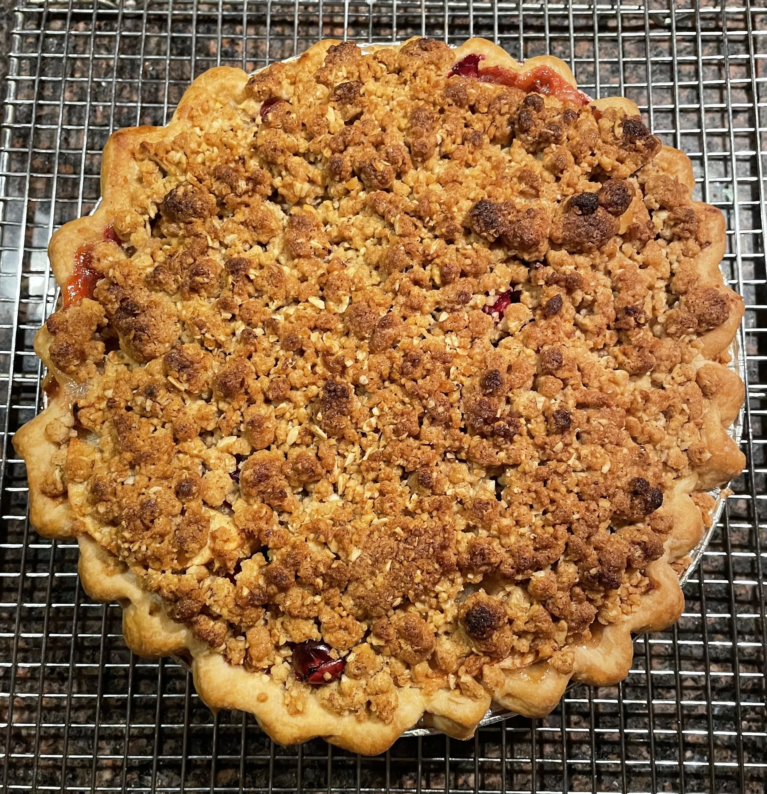 Our apple cranberry pie combines local Cape Cod cranberries and sweet, honey crisp and tart granny smith apples in a rich all-butter crust. Topped with a generous oat crumble, it adds a crispy texture to the fruit filling.
