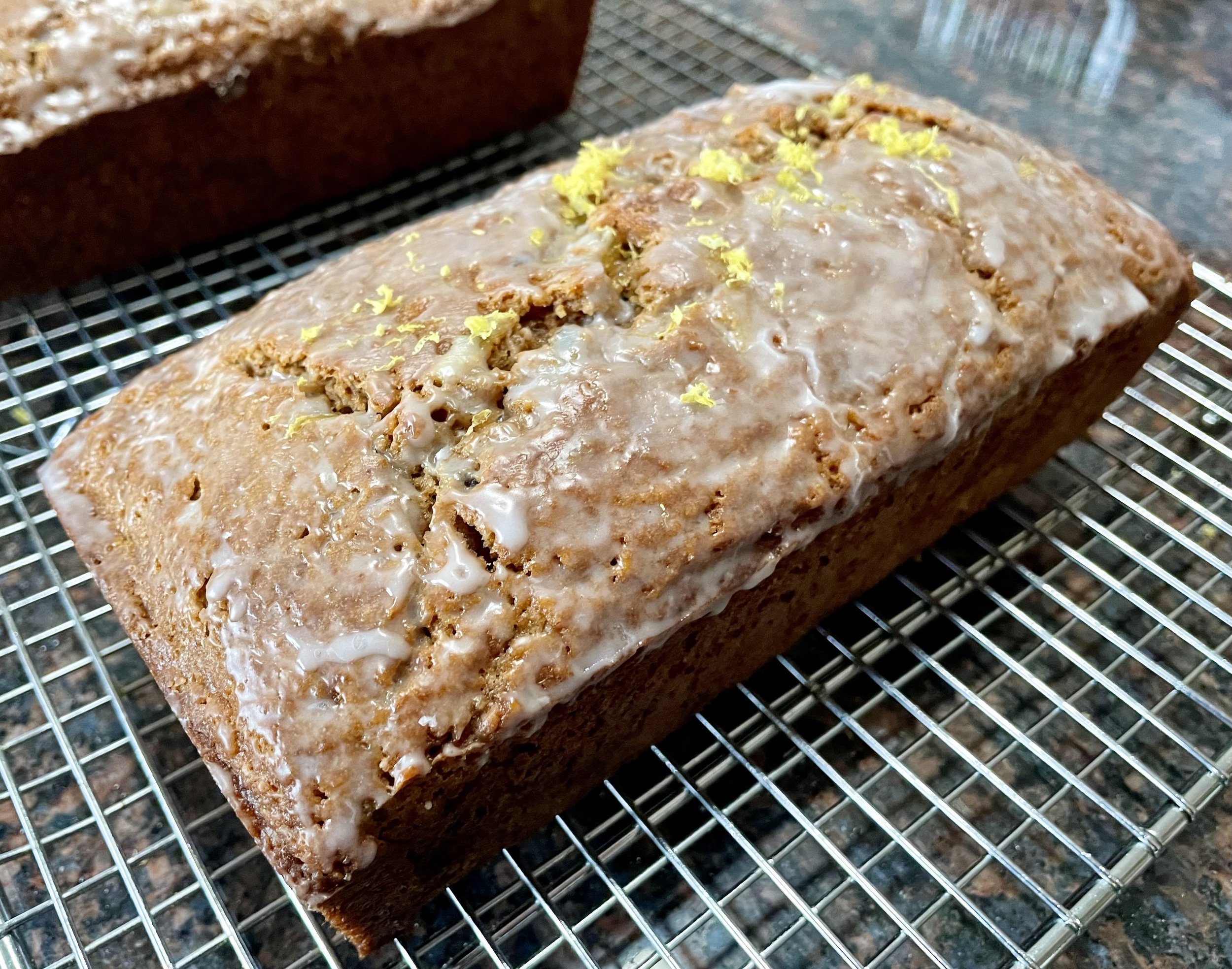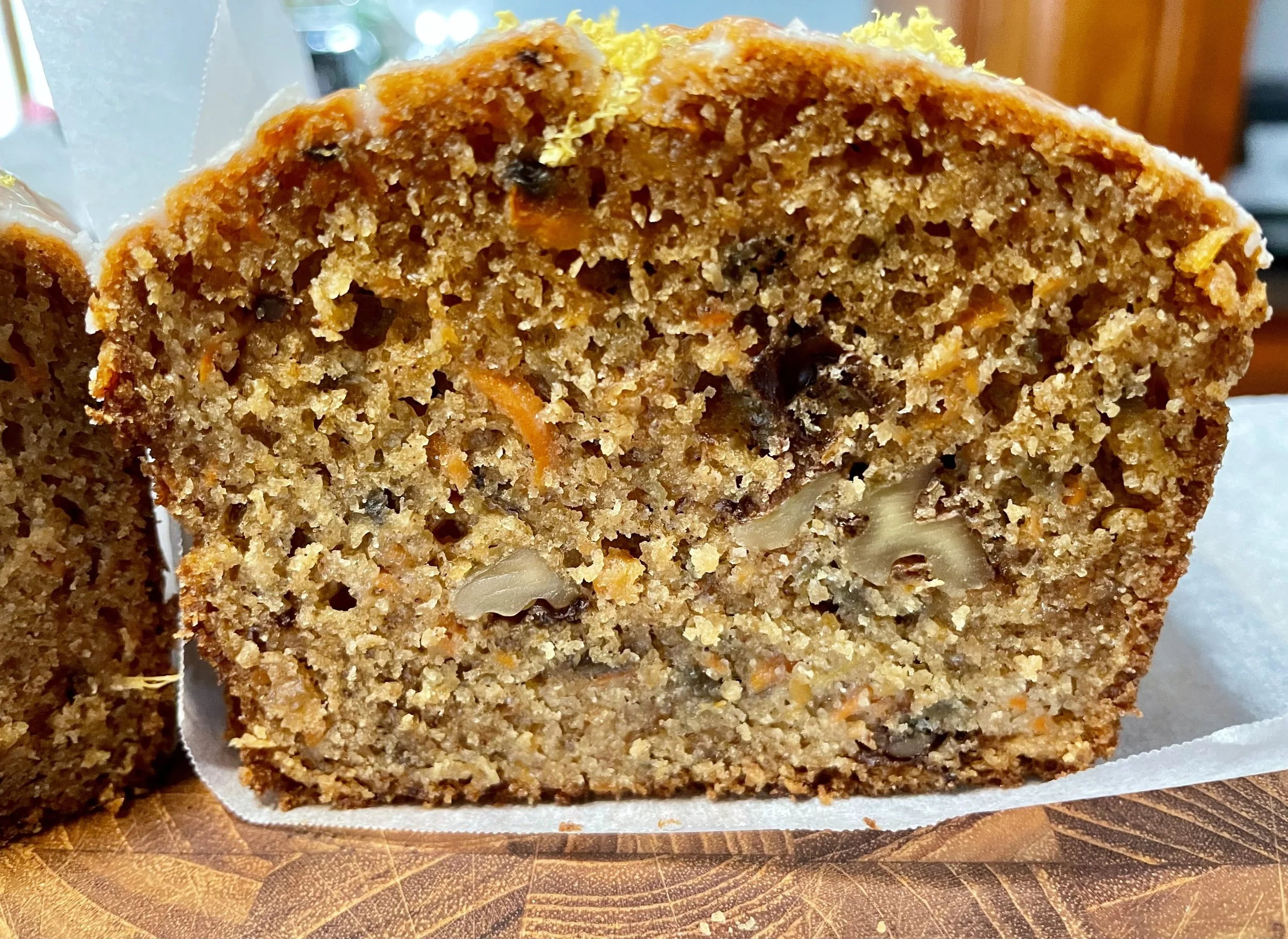 An Easter special that is good to have any time of the year. Organic carrots, candied ginger bits, apple sauce, sour cream, and toasted walnuts. Topped with lite lemon glaze. A customer favorite. size 8 x 4 loaf (8 servings)